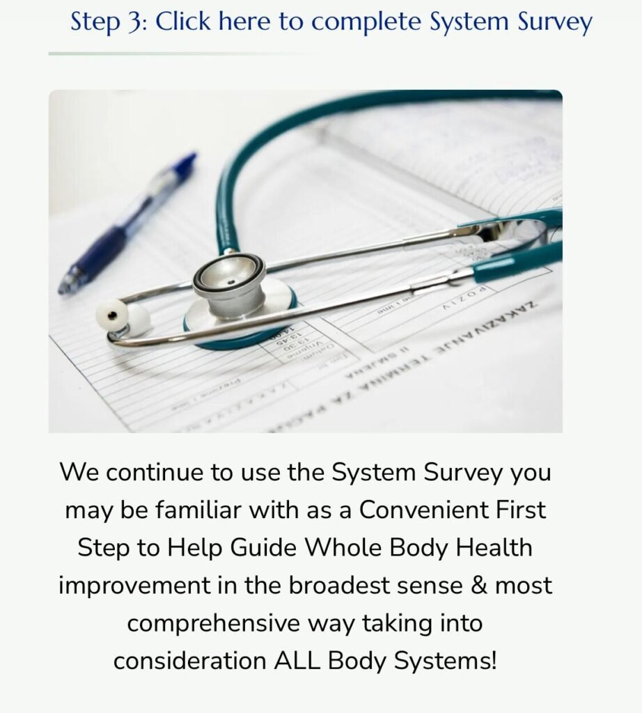 We continue to use the System Survey you may be familiar with as a Convenient First Step to Help Guide Whole Body Health improvement in the broadest sense & most comprehensive way taking into consideration ALL Body Systems!